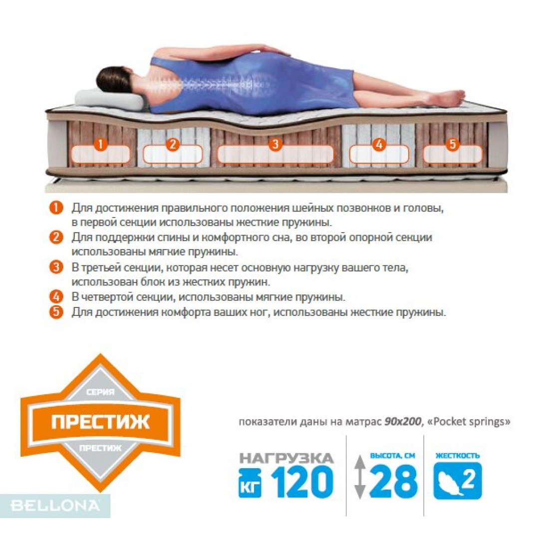Блок независимых пружин - это блок, который обладает особыми эргономическими и механическими свойствами. Он состоит из цилиндрических, или бочонкообразных пружин, каждая из которых находится в отдельном закрытом мешочке и не имеет металлической связки с другими. Сжатие каждой отдельной пружины в блоке происходит назависимо от соседних пружик, создавая тем самым ортопедический эффект и правильную поддержку позвоночника. В данном матрасе применяются блоки независимых пружин с плотностью 500 пружин/кв.м. и диаметром проволоки 1,8 мм. Это очень хороший, высокий показатель.