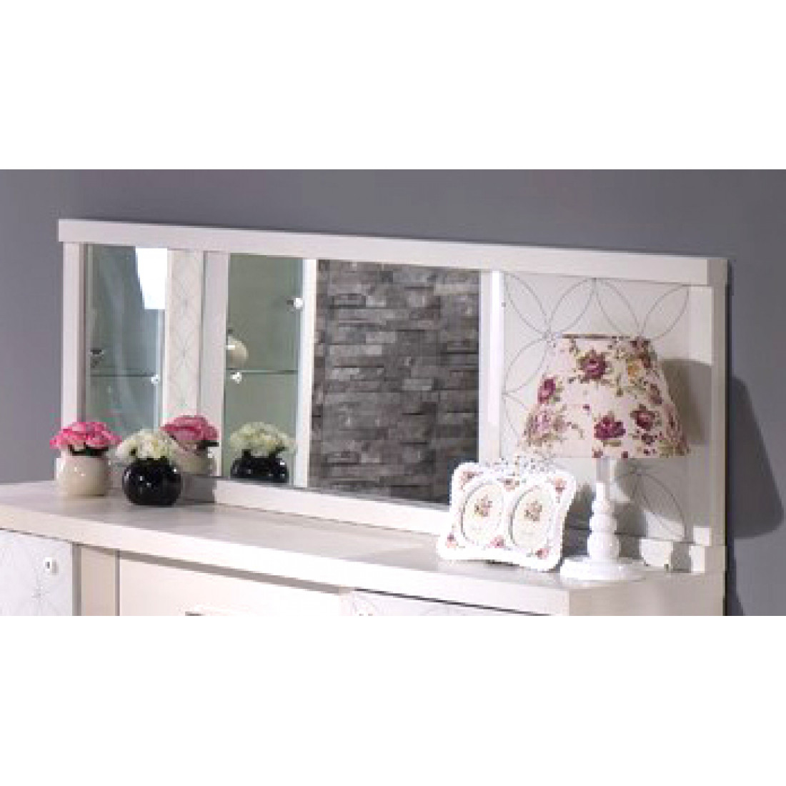 Прямоугольное настенное зеркало MIRA-10 (белое) серии Мира от Беллона предлагается в качестве комплекта к удлиненному комоду. Такуже купить стильно оформленное настенное зеркало можно отдельно. Оно добавить лоска и очарование в общий интерьер, станет притягательным элементом декора: интересное деление на ассиметричные секции дополняется глухой вставкой из матового каленого стекла с лаконичным орнаментом в виде сходящихся соцветий, окончания листьев рисунка украшены стразами Swarovski.