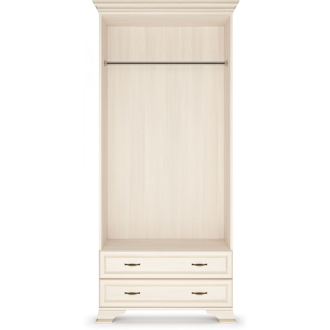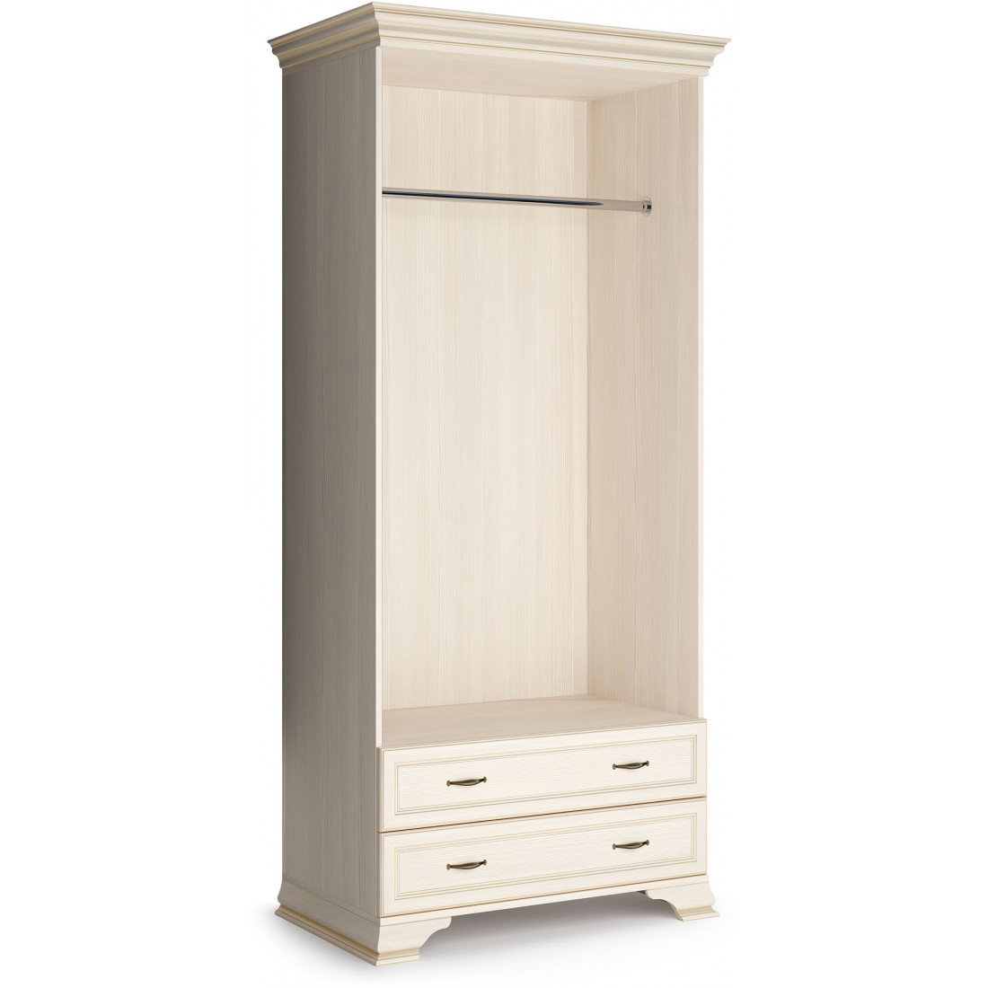 Для Шкафа применяется ЛДСП и МДФ в цвете «бодега белый» с эффектом патинирования золотом. Облик дополняют рамочные фасады и карниз в классическом стиле, а также эффектные опоры из МДФ.