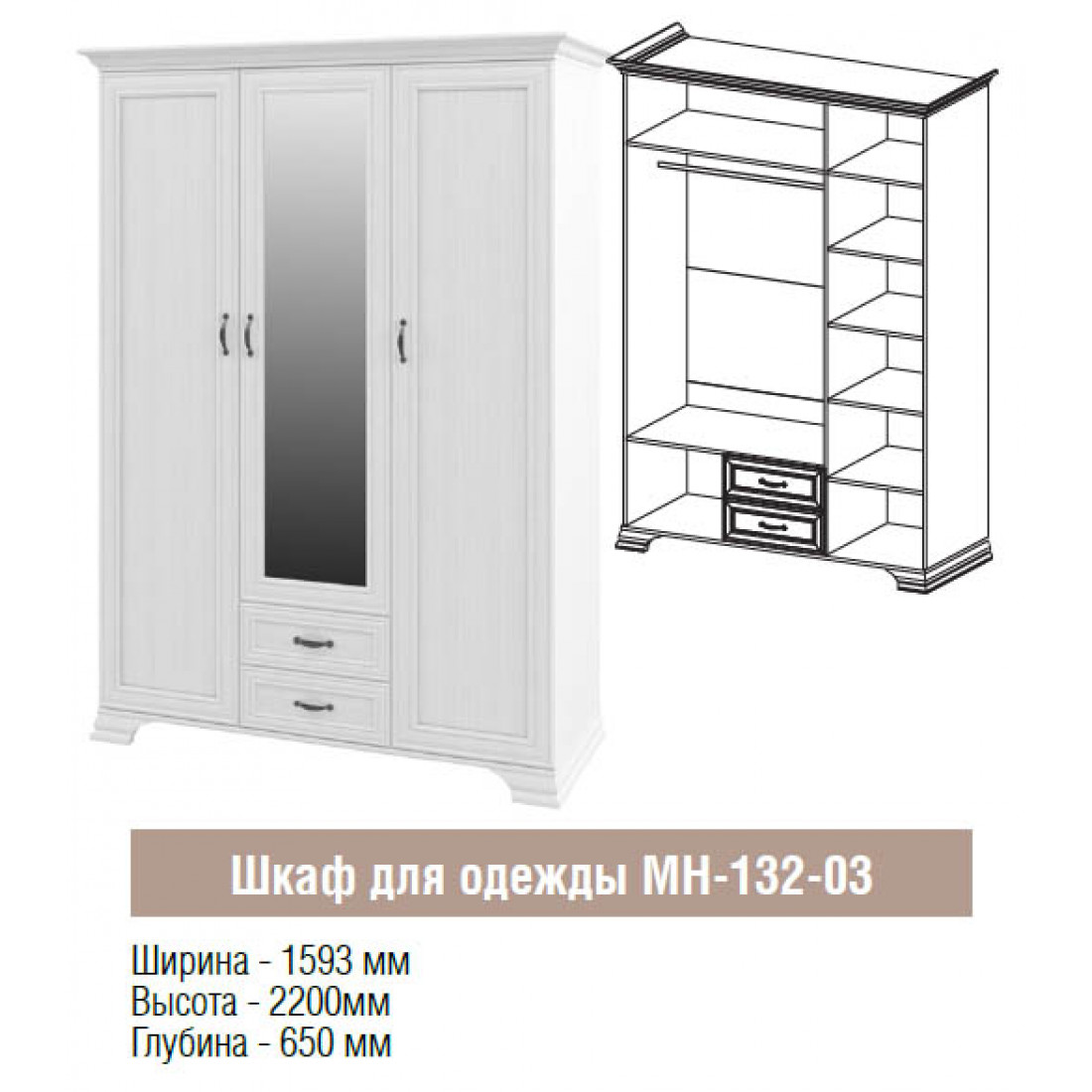 Шкаф Юнона МН-132-03 от фабрики Мебель-Неман - это трехстворчатый шкаф для одежды с зеркалом в классическом стиле с отделкой структурной фактуры, обрамленный рамочным фасадом, где металлические ручки выгодно подчёркивают стиль и изящество, всегда актуален и востребован.